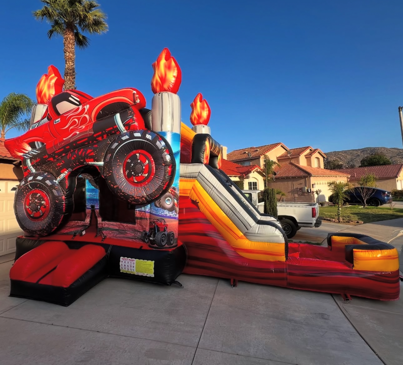Rev your engines! The Monster Truck Slide is one of our tallest and most exciting units. Featuring huge 3D tires and a "Fire & Flame" color scheme, it’s perfect for adrenaline-loving kids.