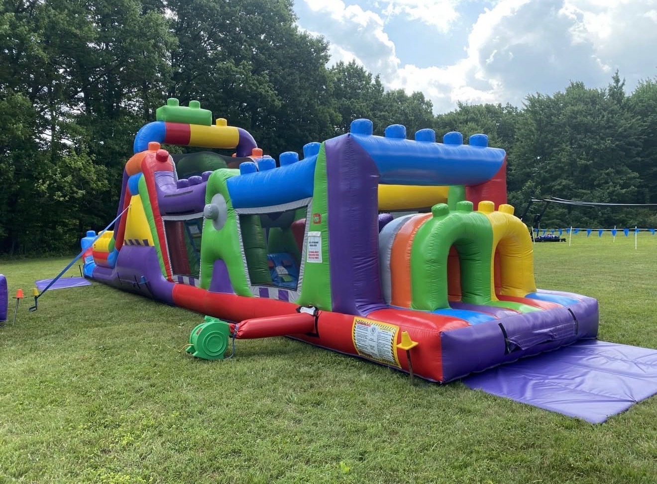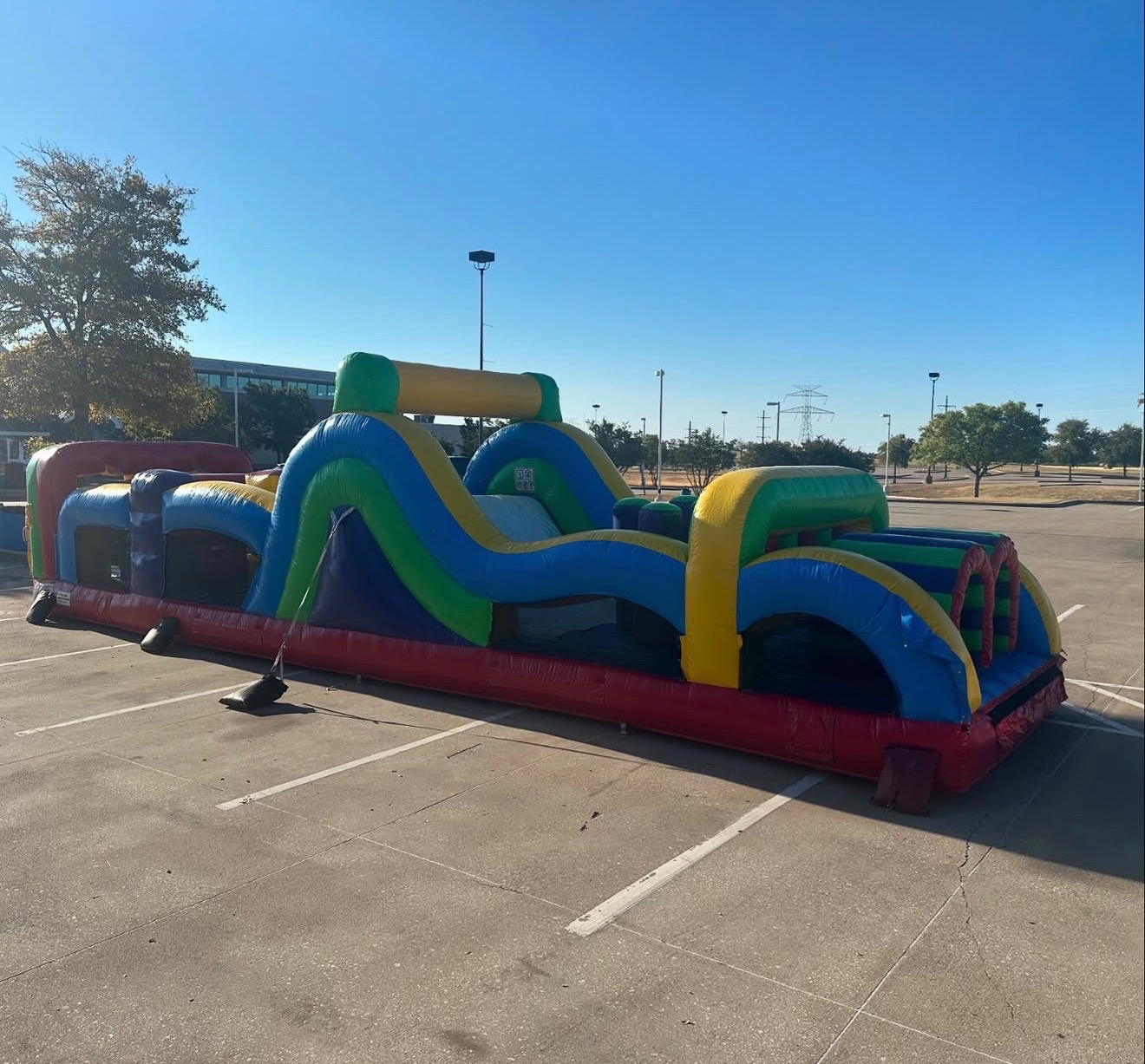 Catch the wave of excitement! This blue, green, and yellow unit features a "rolling wave" design that looks fantastic in the sun. It’s packed with vertical pop-ups and a winding path that challenges balance and speed. Perfect for summer-themed events or field days.