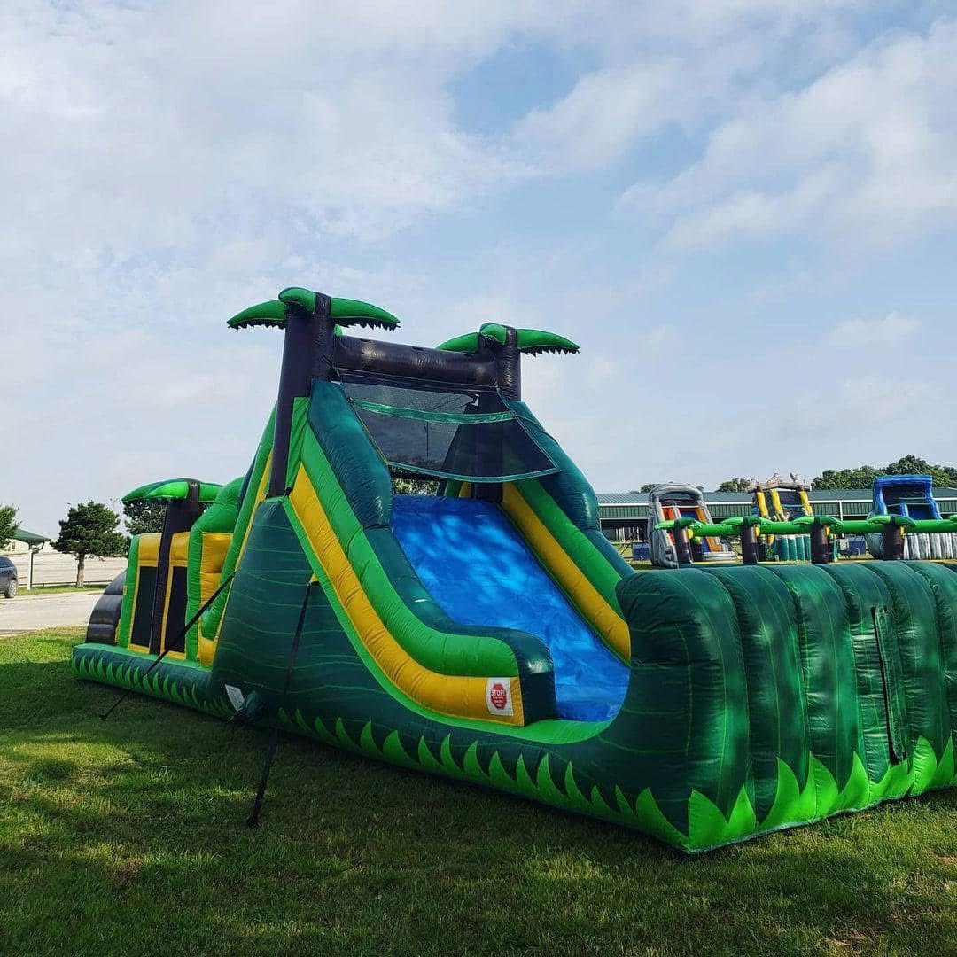 Lush greens and tropical palms make this unit a centerpiece attraction. This course focuses on a wide, steep slide as the main event, preceded by a series of "undergrowth" obstacles. It’s the perfect "wow-factor" rental for luau parties and tropical-themed birthdays.