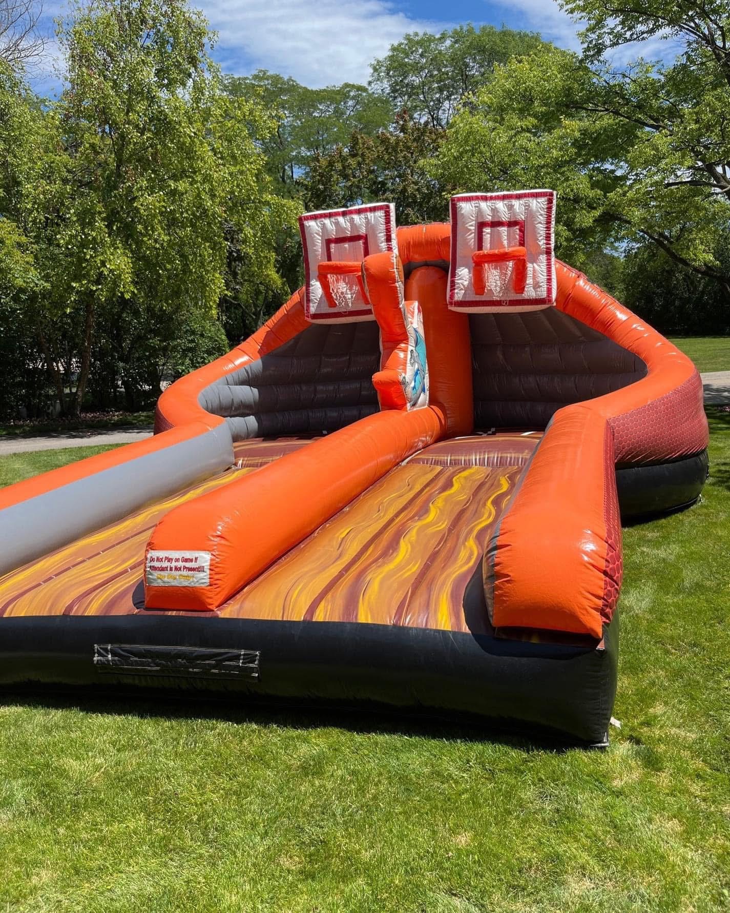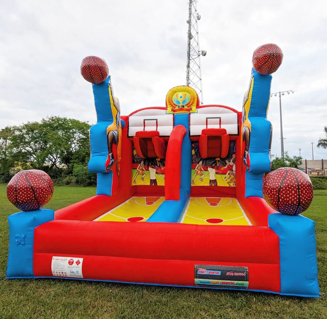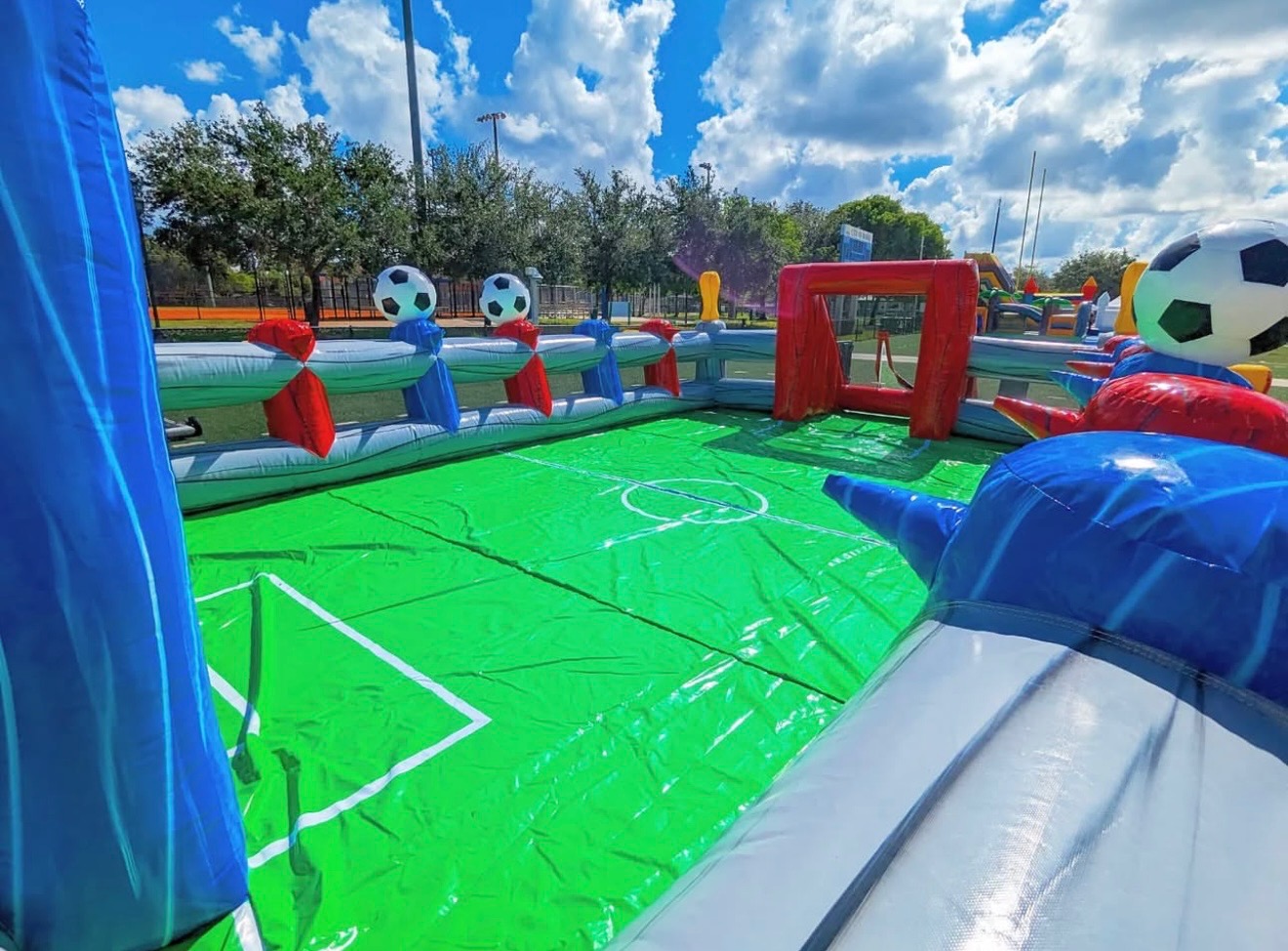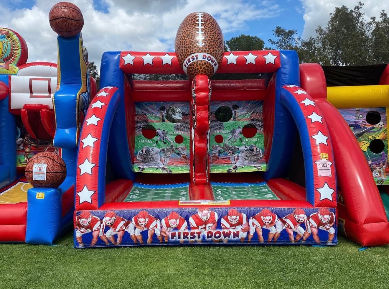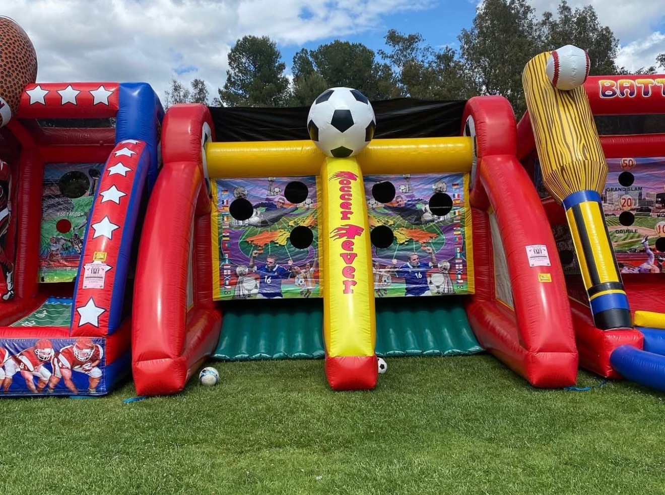 The ultimate crowd-pleaser for sports fans of all ages! This 3-in-1 inflatable features three distinct stations: Basketball, Football, and Soccer. Its open design allows multiple players to compete at once, making it the perfect high-capacity rental for school carnivals, church festivals, or large backyard birthday parties.