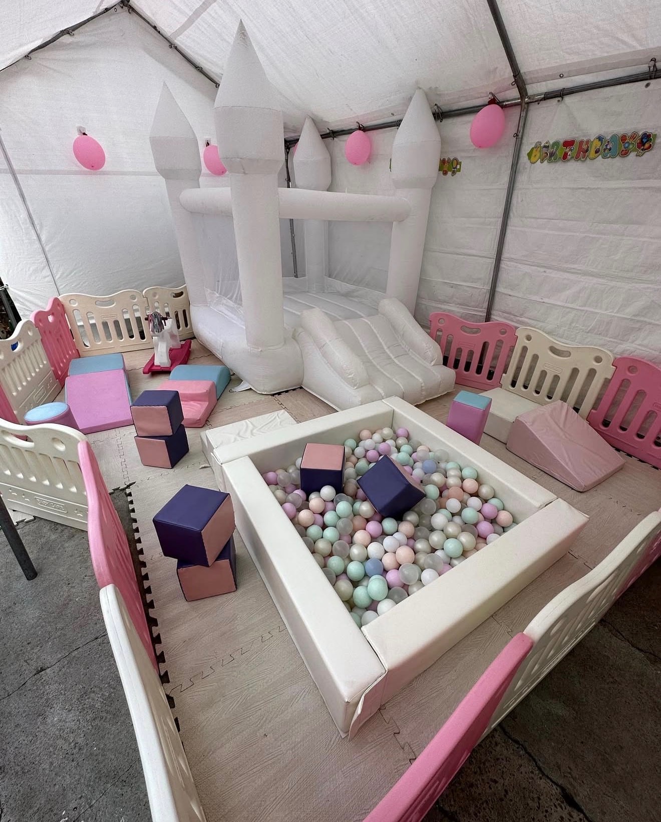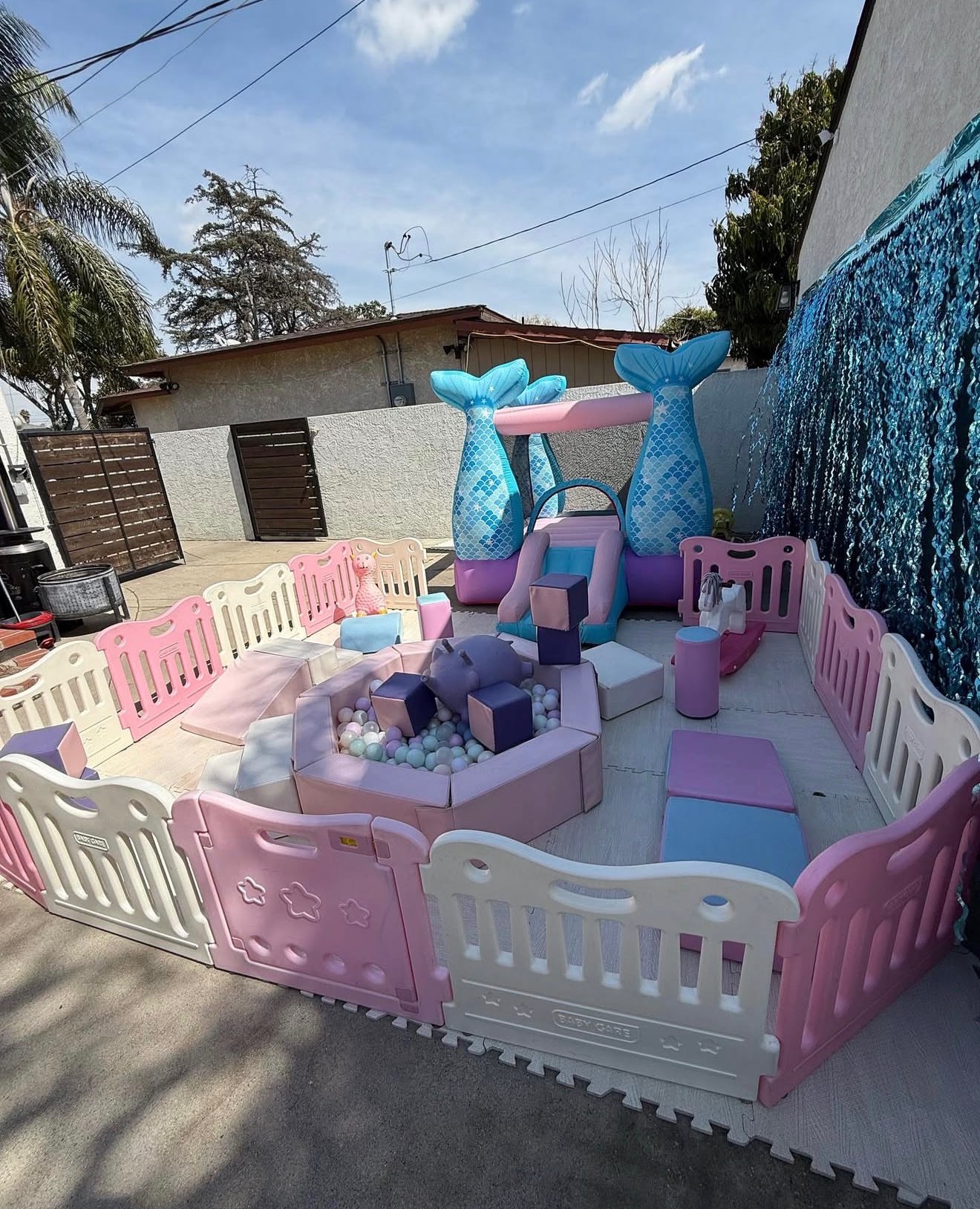 Bring a winter wonderland to any season! This beautiful "Frozen" inspired castle features shimmering blue and white marble vinyl with crystalline spires. It’s a 4-in-1 combo that includes a large jumping area, basketball hoop, climbing wall, and an attached slide.